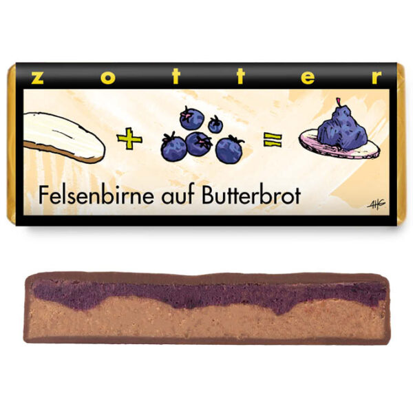 Dunkle Milchschokolade 50% gefüllt mit Felsenbirnenganache und Haselnussnougat, verfeinert mit Schwarzbrotbrösel Fast vergessen und wieder im Trend: Die Felsenbirne wurde