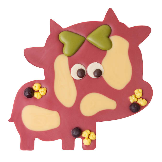 Eine Schokokuh aus rosaroter, fruchtiger Himbeerkuvertüre mit einem Muster aus Maracujakuvertüre. Mit niedlichen Marzipanaugen, zwei Grüntee-Schokoherzen, sonnengelben Maracuja- und blauen Heidelbeer-Schokofrüchten verziert. Verpackt in einer dekorativen Geschenkbox.